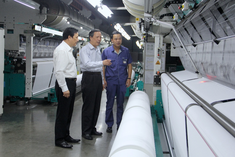 原中共嘉興市委常委、嘉興市副市長(時任中共海寧市委書記)沈雪康(左)在許村經編廠指導工作