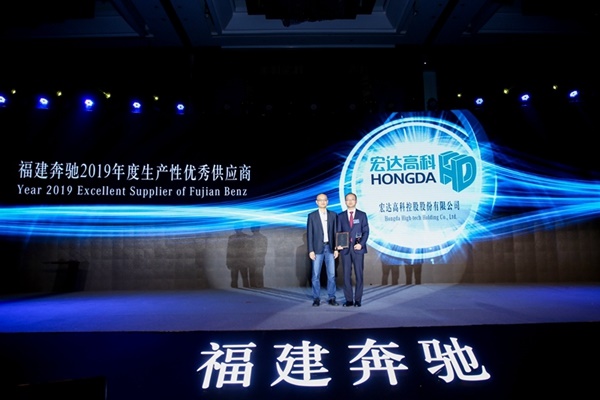 2020年9月29日,2020福建奔馳全球供應(yīng)商大會(huì)在云南昆明舉行。面對(duì)汽車行業(yè)的變革及外部嚴(yán)峻環(huán)境的多重挑戰(zhàn),會(huì)議以“馭變,質(zhì)造柔韌星級(jí)供應(yīng)鏈”為主題。來(lái)自全球的兩百多家供應(yīng)商出席了本次會(huì)議。會(huì)上頒發(fā)了技術(shù)開(kāi)發(fā)配合獎(jiǎng),非生產(chǎn)性優(yōu)秀供應(yīng)商,準(zhǔn)時(shí)供貨獎(jiǎng)及生產(chǎn)性優(yōu)秀供應(yīng)商等榮譽(yù)。宏達(dá)高科榮獲七家2019年度生產(chǎn)性優(yōu)秀供應(yīng)商之一。福建奔馳采購(gòu)副總裁林雄先生為宏達(dá)高科代表頒獎(jiǎng)。