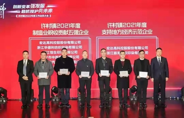2022年2月12日下午,許村鎮召開“創新變革強發展 融杭接滬向未來”2022年度工作動員大會,“宏達高科”在會上獲評“2021年度制造業稅收貢獻五強”和“2021年度支持地方經濟示范企業”榮譽稱號。