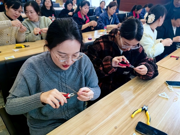 課堂上,海宮的專業老師拿起制作材料,向女職工們演示手串制作。現場女職工們面前擺放著手串的制作材料,以及珠寶鉗等制作工具。在老師的耐心指導下,大家紛紛制作起了手串,感受手工帶來的魅力。